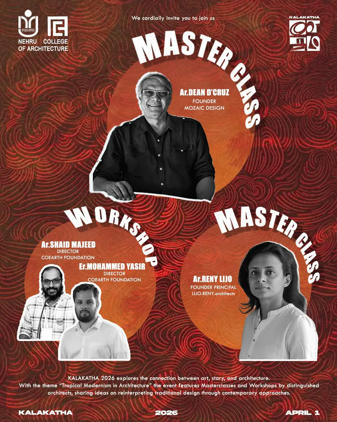 Nehru College of Architecture invites you to KALAKATHA 2026 on April 1, 2026. This event blends architecture, art, and storytelling to explore the theme: Tropical Modernism in Architecture.