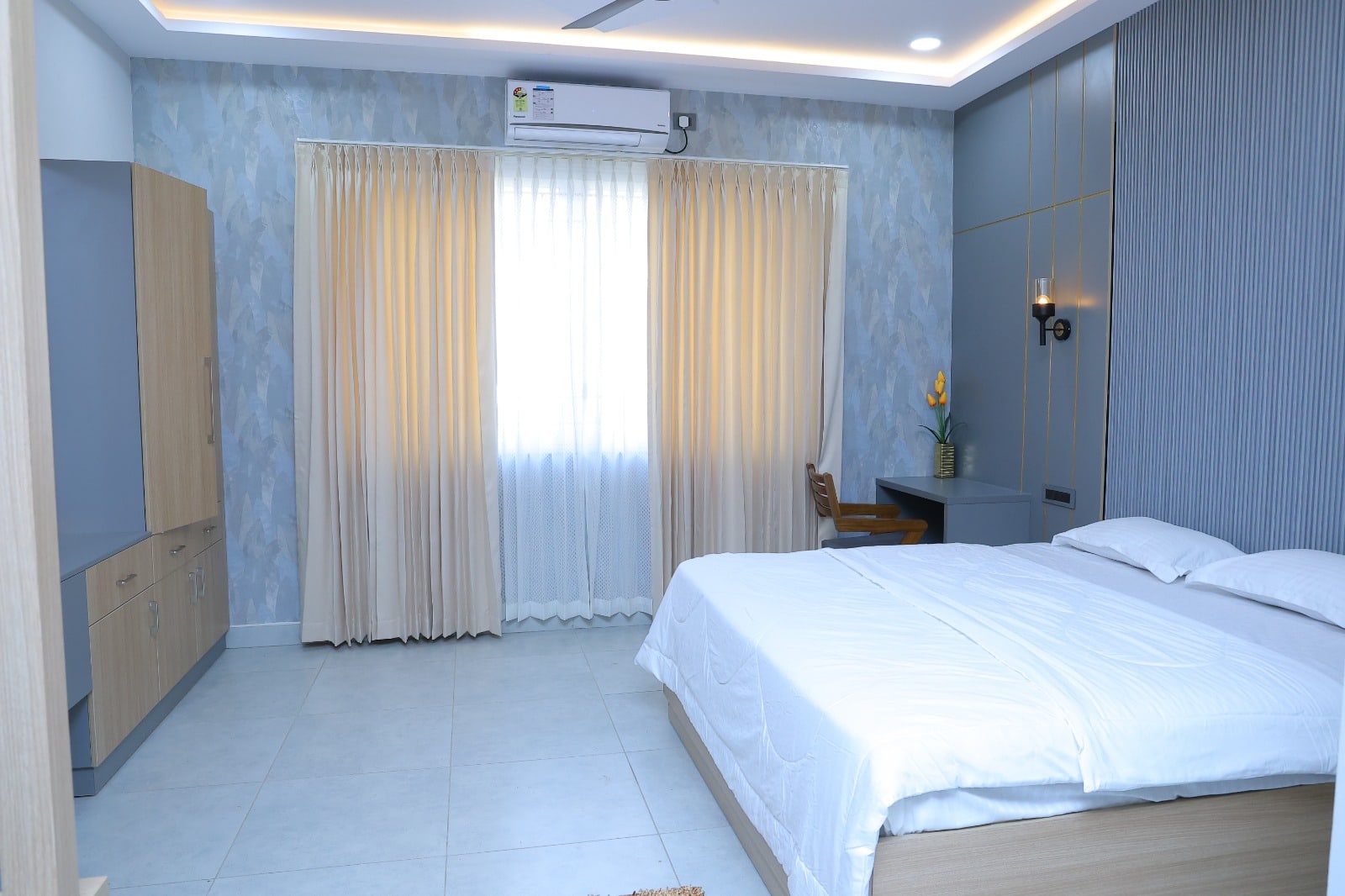 Learn MoreWelcome to our warm and inviting guest room, thoughtfully designed to offer comfort and relaxation. The room features a cozy bed with fresh linens, ample storage space, and soft lighting to create a peaceful atmosphere. Equipped with essential amenities such as a fan/AC, Wi-Fi, and a clean attached bathroom, it provides a homely yet private space for rest. Ideal for travelers, family, or friends, this guest room ensures a pleasant and restful stay.